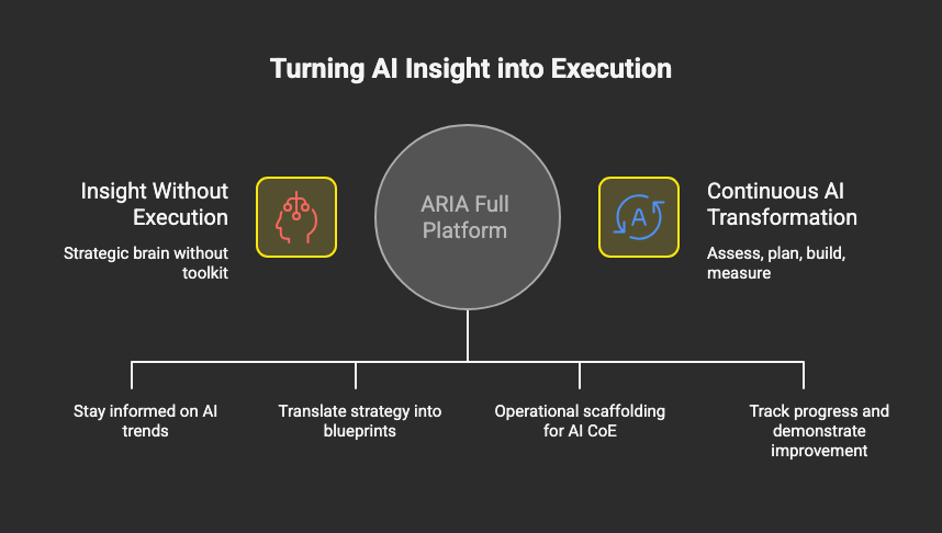 ARIA exists because we believe every enterprise leader deserves access to world-class AI transformation advisory — not just the ones who can afford seven-figure consulting engagements. The knowledge gap between AI leaders and AI laggards is widening, and closing it requires tools that are intelligent, contextual, and continuously improving.
